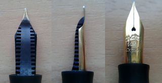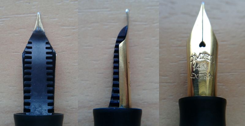 Foto di una Omas Lucens in celluloide marmorizzata verde, dimensione media. Dettaglio del pennino. Contributo di Giorgio (utente forum Musicus).