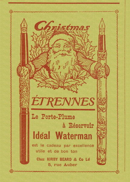 Scansione di una pubblicità Waterman datata 1905-12-16. Pubblicazione su: L'Illustration, vol. 3277. Ritoccata dall'autore per una migliore nitidezza. Data dal reperimento della pagina su una versione archiviata della rivista. Pubblicizza due 14 con caricamento a contagocce e rivestimento con decorazioni a rilievo.