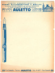 Scansione di un foglio di taccuino Auletto datata 1935. Ritoccata dall'autore per una migliore nitidezza. Data indicativa, dallo stile penna illustrata. Pubblicizza un negozio di Torino. Contributo di Paolo, http://www.zona900.it, (utente forum fountainpen.it sanpei).