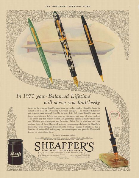 Scansione di una pubblicità Sheaffer datata 1929-09-07. Pubblicazione su: The Saturday Evening Post. Ritoccata dall'autore per una migliore nitidezza. Data riportata sul retro del foglio. Pubblicizza il modello Balance e la garanzia Lifetime, e menziona la boccetta Safety Skrip.