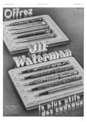 Scanning of advertising from Waterman dated 1935-12-28. Published on: L'Illustration. Retouched by the author for a better sharpness. Date directly visible. Advertising different models (32, 94, Patrician, Ink-Vue, 452) and some JiF pencils.