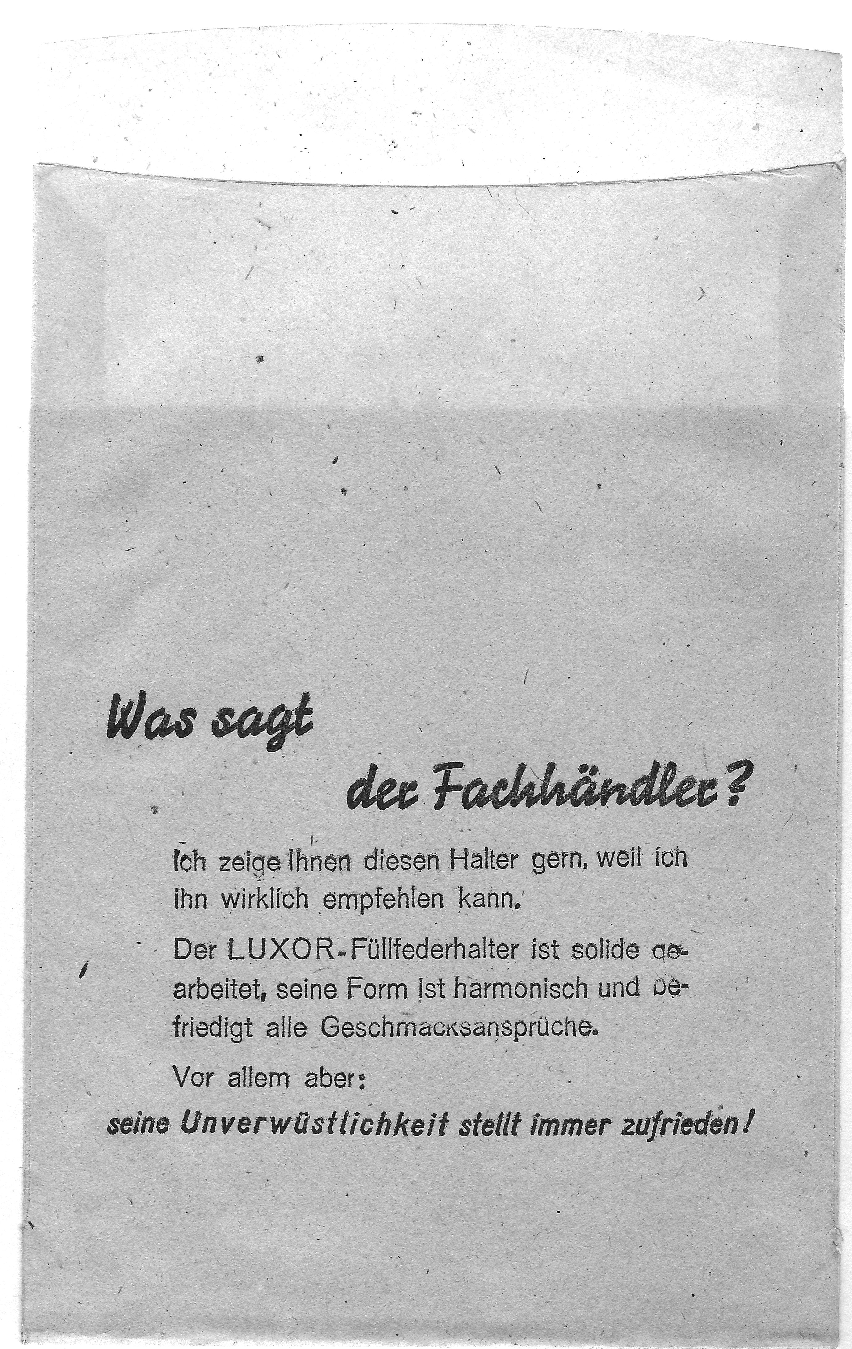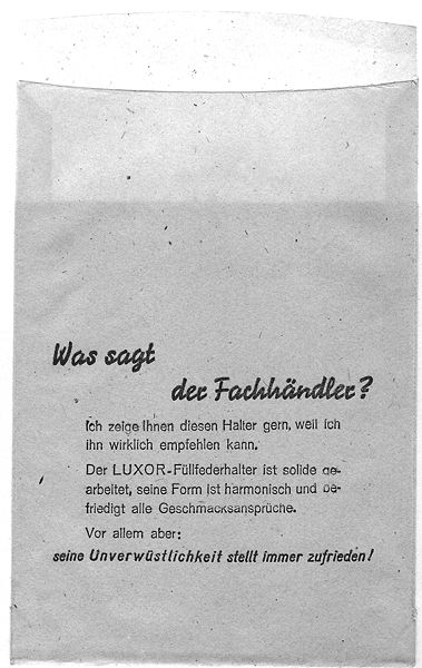 Scansione di una busta Luxor datata 1955. Data indicativa, dal modello raffigurato. Retro. Sull'altro lato di File:1950-Luxor-Envelope-Front.jpg. Ritoccata dall'autore per una migliore nitidezza.