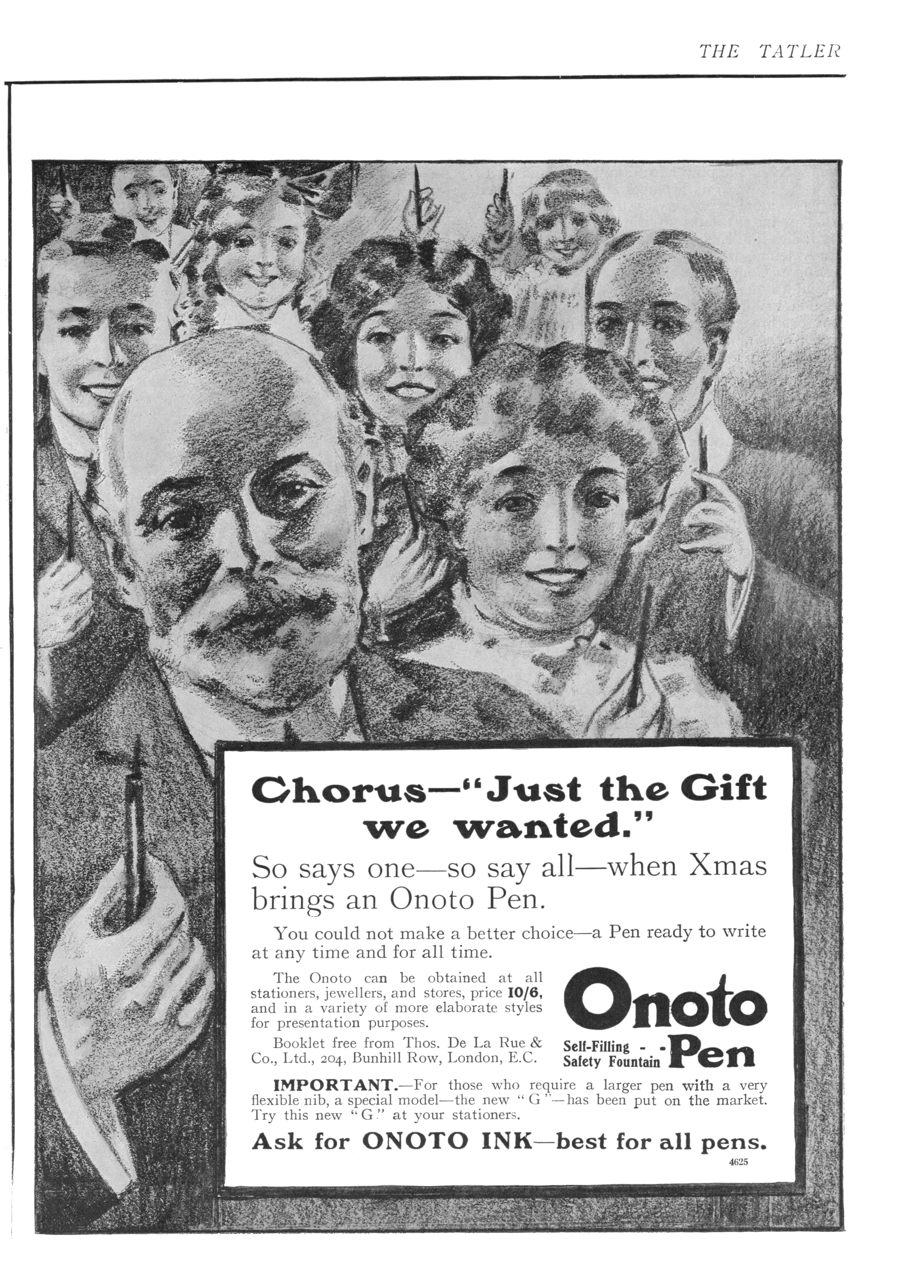 Scansione di una pubblicità Onoto datata 1911. Pubblicazione su: The Tatler. Ritoccata dall'autore per una migliore nitidezza. Data indicata dal fornitore. Pubblicizza delle penne della serie 3000, ed in particolare riporta l'ingresso sul mercato di una nuova Onoto G con pennino molto flessibile.