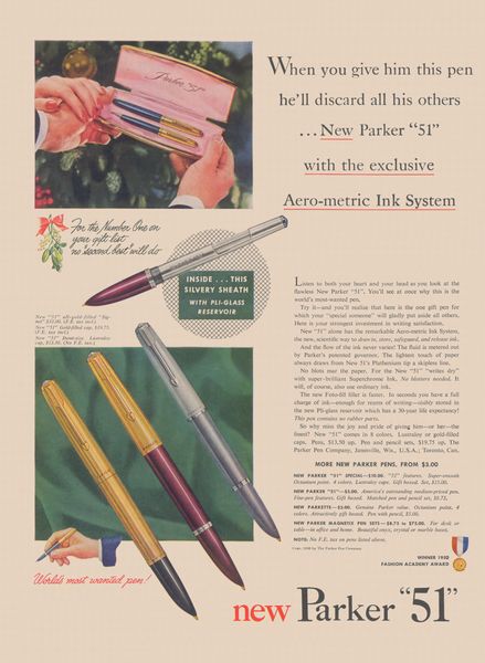 Scansione di una pubblicità Parker datata 1950. Ritoccata dall'autore per una migliore nitidezza. Data visibile direttamente. Pubblicizza il modello Parker 51, nelle due dimensioni normale e piccola (demi-size) e con la versione con corpo e cappuccio in metallo laminato denominata Signet. Illustra l'Aero-metric Ink System con il caricamento chiamato Foto-fill filler e il serbatoio in Pli-glass. Menziona anche il modello Parker 21 ed il Superchrome Ink.