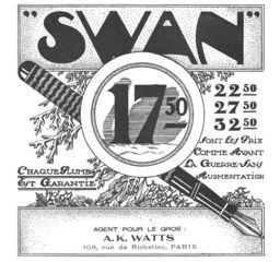Scanning of advertising from Swan dated 1910. Published on: L'Illustration. Retouched by the author for a better sharpness. Dating given by the provider. Advertising for an overfeed eyedropper model called generically Swan Pen.
