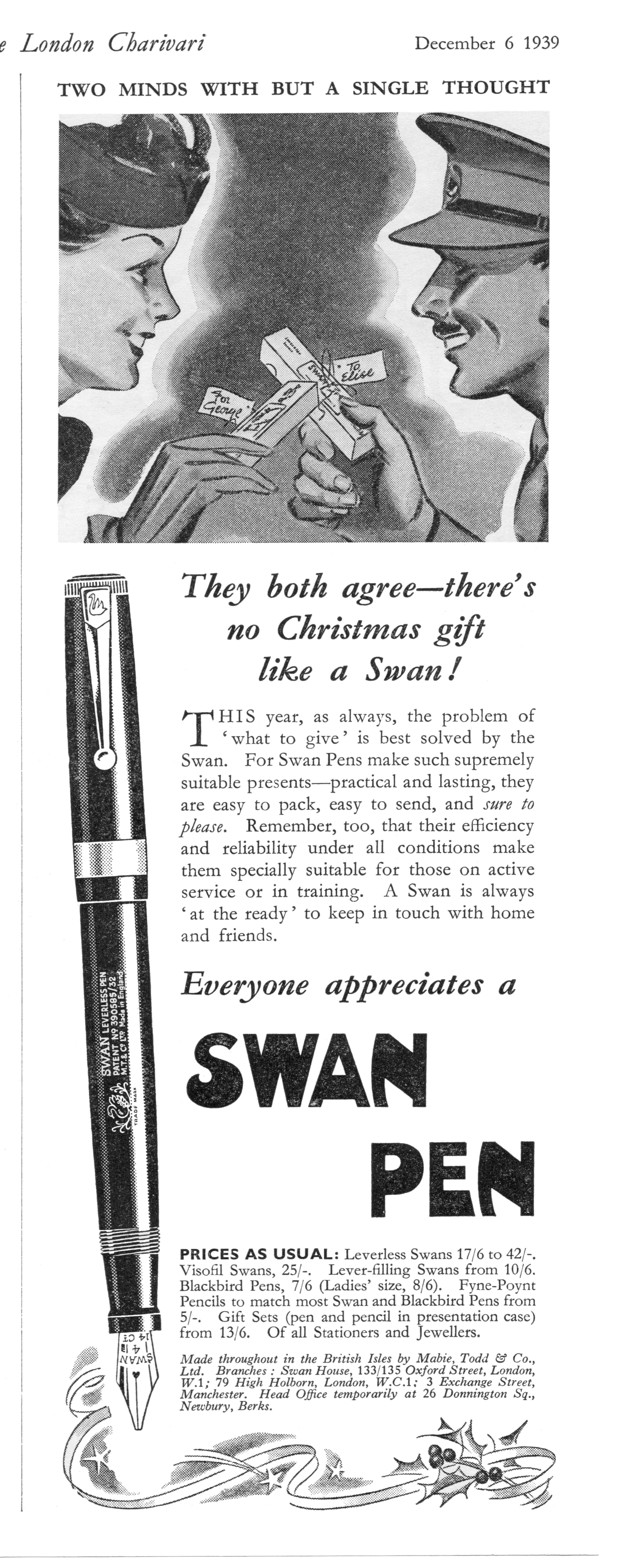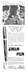 Scansione di una pubblicità Swan datata 1939-12-06. Pubblicazione su: Punch - or the London Charivari. Ritoccata dall'autore per una migliore nitidezza. Data visibile direttamente. Pubblicizza una Leverless, citando anche altri modelli (la Visofil, modelli con caricamento a levetta e modelli Blackbird).