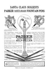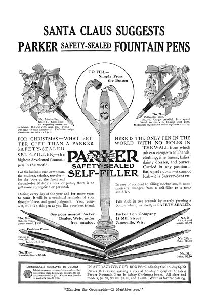 Scansione di una pubblicità Parker datata 1916-11. Pubblicazione su: The National Geographic. Ritoccata dall'autore per una migliore nitidezza. Data indicata dal fornitore, affidabile. Pubblicizza un modello Parker Lucky Curve, illustra i pregi del caricamento a pulsante di fondo, l'assenza di aperture nel corpo (denominata Safety-Sealed) e mostra un modello trasparente in bachelite.