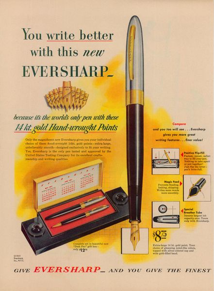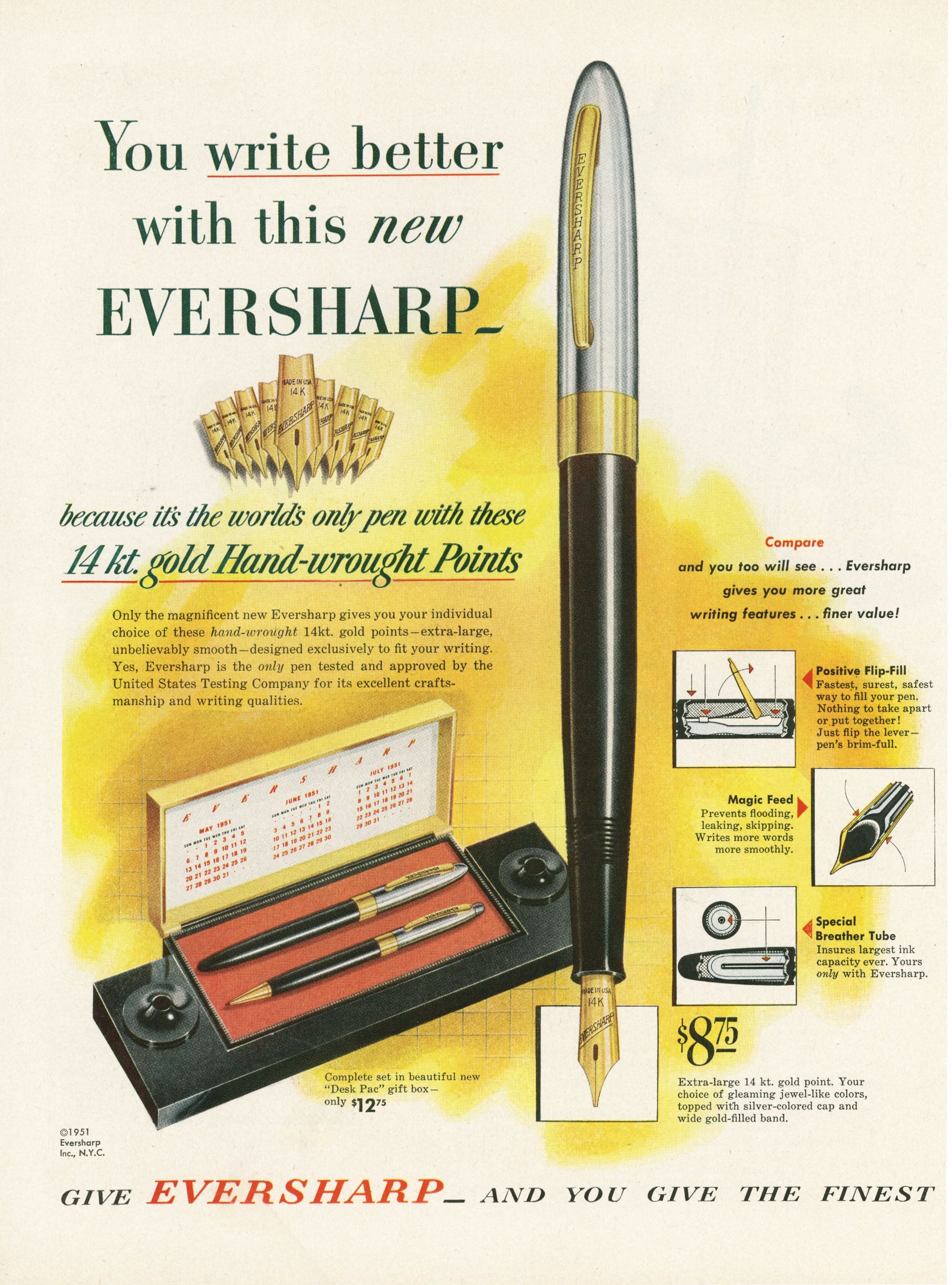 Scansione di una pubblicità Eversharp datata 1951-06-11. Pubblicazione su: Life. Ritoccata dall'autore per una migliore nitidezza. Data ottenuta dal reperimento della pagina su Google Books. Pubblicata anche sul The Saturday Evening Post. Pubblicizza il modello Symphony ed evidenzia le caratteristiche dell'alimentatore Magic Feed e del caricamento a levetta denominato Positive Flip-Fill.
