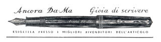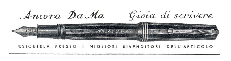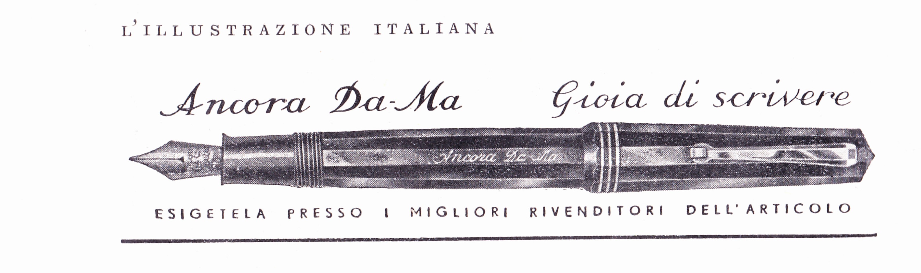 Scansione di una pubblicità Ancora datata 1937-08-15. Pubblicazione su: L'Illustrazione Italiana, anno LXIV, n. 33, pag. III. Data ottenuta da quella di pubblicazione del volume da cui la pagina è estratta. Pubblicata anche su: anno LXV, N. 1 (1938-01-02), N. 3 (1938-01-16), N. 5 (1938-01-30). Pubblicizza il modello Da-Ma. Contributo di Giorgio (utente forum Musicus).