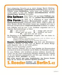 Scansione di un libretto Roeder datata 1925. Ritoccata dall'autore per una migliore nitidezza. Data indicativa, sta per gli anni '20. Pubblicizza una serie di modelli rientranti dell'azienda. Retro. Sull'altro lato di File:192x-Roeder-Brochure-p01.jpg.
