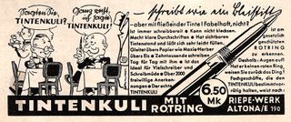 Scansione di una pubblicità Rotring datata 1936-05. Pubblicazione su: Die Zirilversorgung. Ritoccata dall'autore per una migliore nitidezza. Data indicata dal fornitore. Pubblicizza la Tintenkuli.