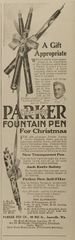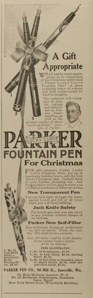 Scansione di una pubblicità Parker datata 1914-12-05. Pubblicazione su: Collier's. Ritoccata dall'autore per una migliore nitidezza. Data dal reperimento della pagina su una versione archiviata della rivista. Pubblicizza un modello Parker Lucky Curve, illustra i pregi del caricamento a pulsante di fondo, il corpo trasparente (in bachelite) e la chiusura di sicurezza denominata Jack Knife Safety.