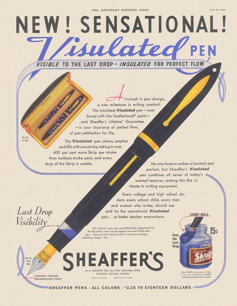 Scansione di una pubblicità Sheaffer datata 1936-06-25. Ritoccata dall'autore per una migliore nitidezza. Data visibile direttamente. Pubblicizza una Balance con caricamento a levetta dotata del nuovo sistema Visulated per la visualizzazione delle ultime gocce del livello di inchiostro. Vengono menzionati anche il pennino Feathertouch, la boccetta Skrip-Well e la garanzia la garanzia a vita Lifetime. Contributo di Armando Dabbene (utente forum fountainpen.it A Dabbene).