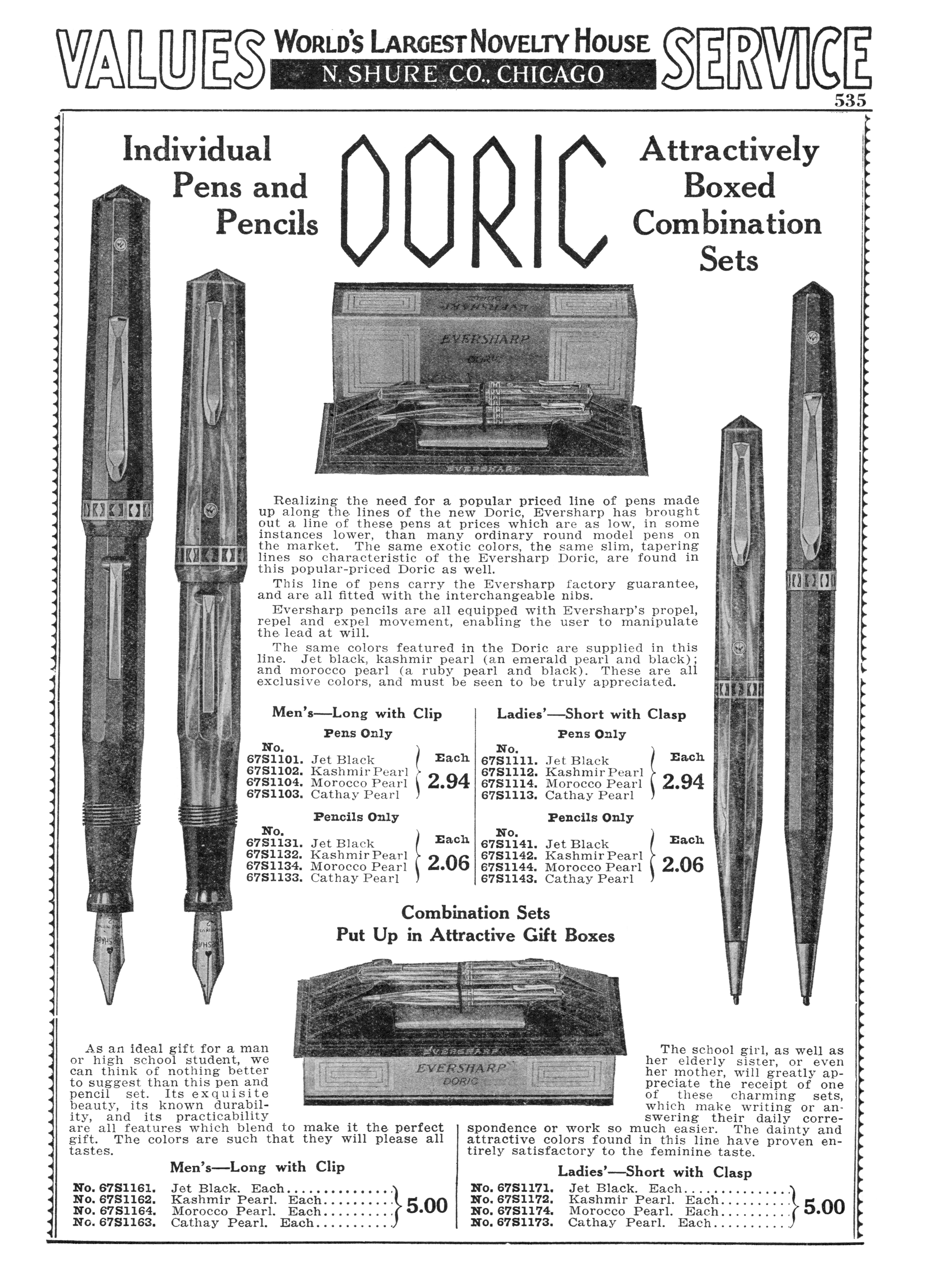 Scansione di una pubblicità Eversharp datata 1933. Pubblicazione su: N. Shure Catalog. Ritoccata dall'autore per una migliore nitidezza. Data indicativa, dai modelli presenti, sta per la prima metà degli anni '30. Pubblicizza i modelli Doric della versione di seconda fascia in due misure (Men's, Long with Clip e Ladies', Short with Clasp) con i relativi colori (Jet Black, Kashmir Pearl, Morocco Pearl, Cathay Pearl) e di quelli di prima fascia in quattro misure (Oversise, Long with Clip, Regulation size, Long with Clip, Regulation size, Short with Clip e Ladies size, Short with Ring) con i relativi colori (Ebony Black, Kashmir Pearl, Burma Pearl, Cathay Pearl, Morocco Pearl). Sull'altro lato di File:193x-Doric-EtAl-ShureCatalog-p04.jpg.
