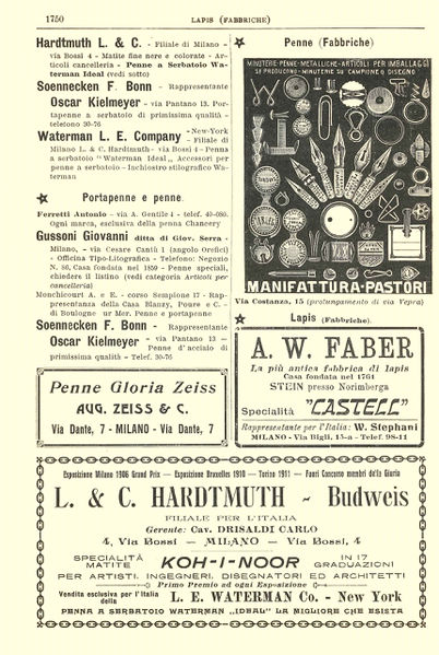 Scanning of a catalog page dated 1914. Published on: Savallo, Guida di Milano e Provincia. Retouched by the author for a better sharpness. Dating established by the publication date of the volume from which the page is taken. Reporting addresses for the Soennecken and Waterman (managed by Hardtmuth L&C directed by Cav. Drisaldi) italian agents. Also advertising from Hardtmuth for its Koh-i-Noor pencils and Waterman fountain pens, from Faber Castell for its pencils, and from an unidentified Gloria Zeiss pen producer (unknow relation to later Gloria brand).