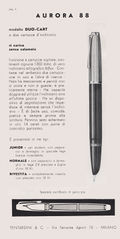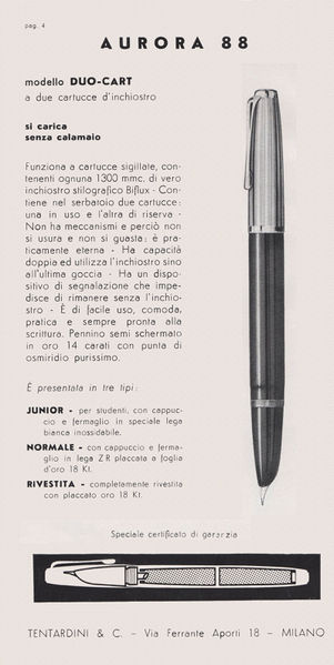 Scansione di una pagina di catalogo datata 1954. Pubblicazione su: Ditta Tentardini & C. Milano. Ritoccata dall'autore per una migliore nitidezza. Data indicativa, desunta dai modelli riportati. Quarta pagina. Pubblicizza il modello Aurora Duo-Cart, cita tre versioni, "Junior", "Normale" e "Rivestita". Contributo di Giorgio (utente forum Musicus).