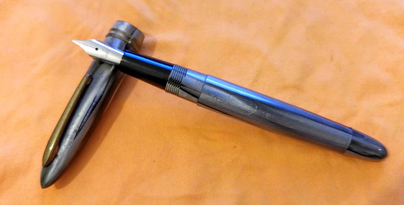 Foto di una Alba modello M2 N6 (?) in celluloide grigia striata, forme affusolate. Contributo di roccopin (utente forum roccopin).