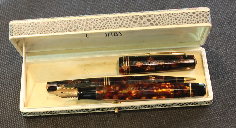 Photo of an Omas Extra Lucens, in transparent marbled brown celluloid. Biggest size. Photo taken at Brescia Pen Show 2016.