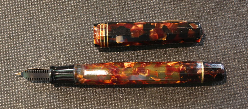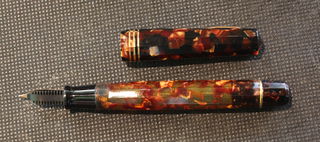 Photo of an Omas Extra Lucens set, in transparent marbled brown celluloid. Biggest size. Photographed at 2016 Brescia Pen Show.