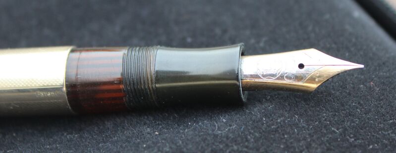 Photo of a Montblanc 136, with an engine turned rolled gold overlay. Photographed at 2014 Cologne Pen Show.