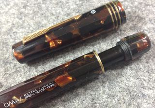 Photo of an Omas Extra Lucens, in marbled brown celluloid. Biggest size.