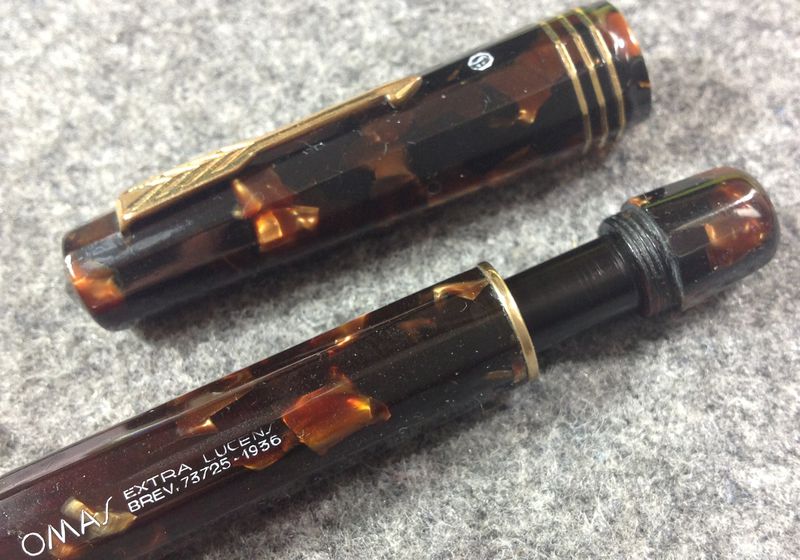Foto di una serie di una Omas Extra Lucens in celluloide marmorizzata marrone, versione della dimensione massima. Contributo di Massimo, utente forum Maxpen2012.
