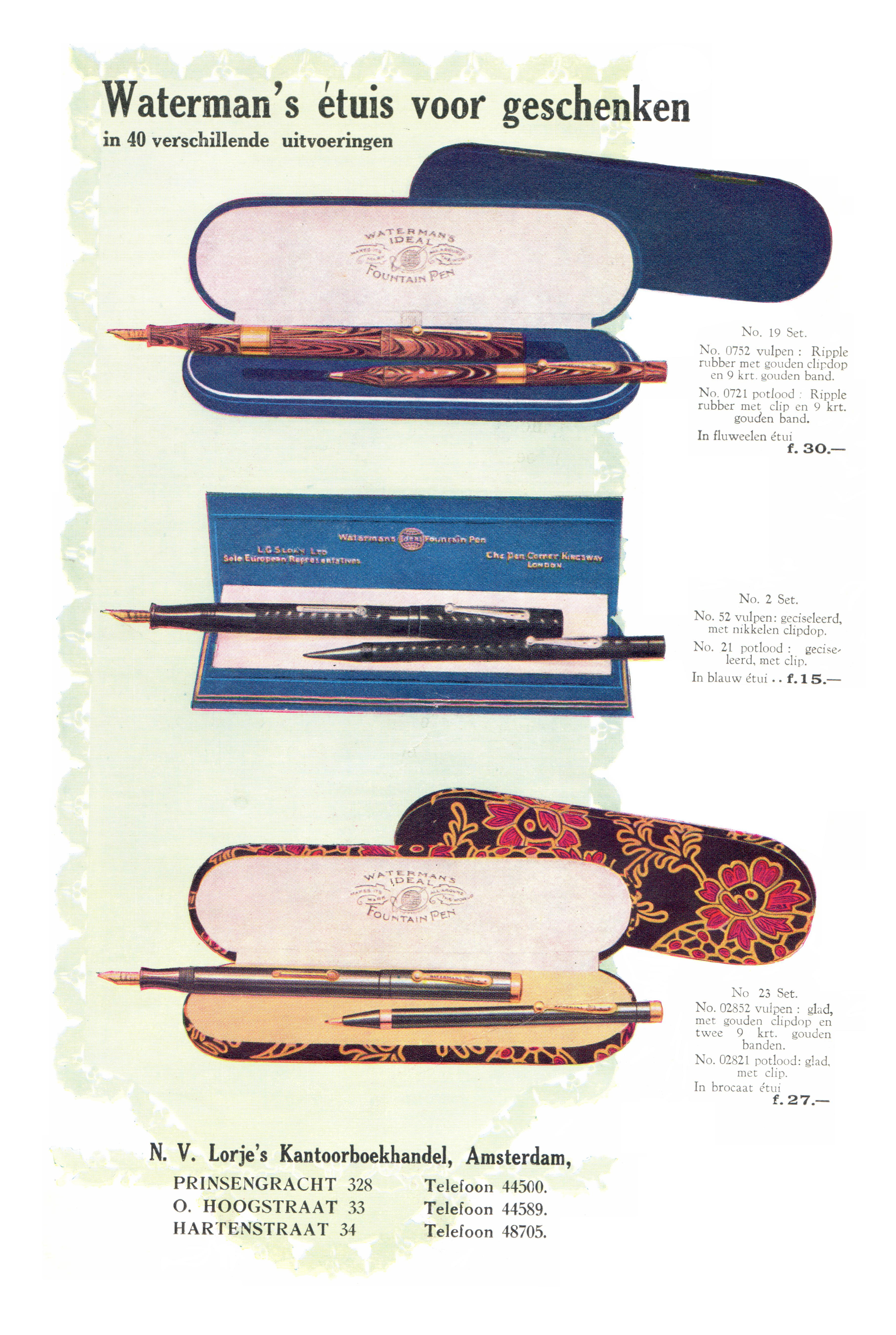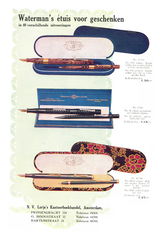 Scansione di una pubblicità Waterman datata 1928. Ritoccata dall'autore per una migliore nitidezza. Data indicativa, dai modelli illustrati. Pubblicizza vari modelli del tempo: in questa pagina la 52 in ebanite nera cesellata, la variante 02852 in ebanite nera con clip dorata e bande in oro 9 carati e la variante 0752 in ebanite fiammata con banda e clip in oro 9 carati. Retro. Sull'altro lato di File:192x-Waterman-5x-9x-Ripple-Brochure-pp02-03.jpg.