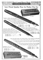 Scanning of a catalog page dated 1940. Published on: N. Shure Catalog. Retouched by the author for a better sharpness. Date directly visible. Advertising for the Parker lever filler economy lines, with the models named Writefine (in "Congo Black", "Regal Blue", "Egyptian Green" and "Indian Maroon" colors) and Parkette Zephyr (in "Blue", "Brown", "Gray" and "Black" colors). Mention also for the Parkette Zephyr the Visometer ink level visualization system and the cellouloid called Pyralin. On the other side of File:1940-Shure-Parker-Wahl-p694.jpg.