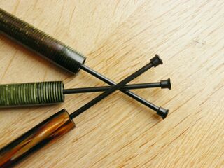 Foto di una Ancora Maxima marchiata Mastilo in celluloide anellata varde affiancata ad due Maxima dello stesso tipo. Particolare dell'albero della siringa. Contributo di Ambros (utente forum Ambros5).