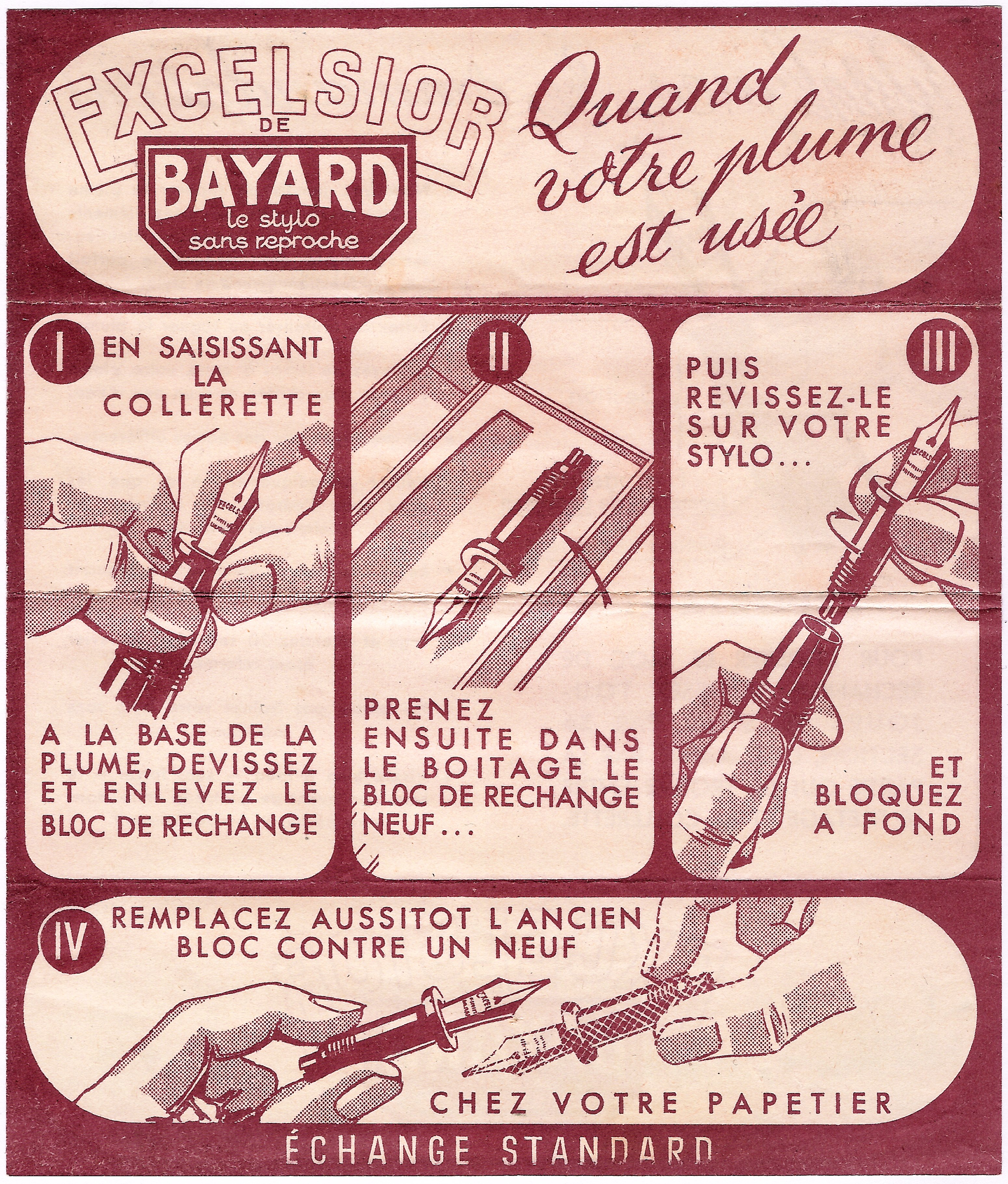 Scansione di un foglietto di istruzioni Bayard degli anni '40. Relativo ad un modello Excelsior. Retro. Sull'altro lato di File:Bayard-Excelsior-Instro-Front.jpg. Da una confezione originale Ritoccata dall'autore per una migliore nitidezza.