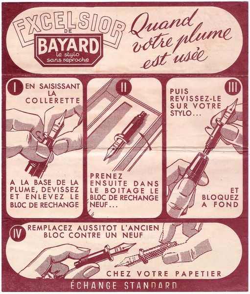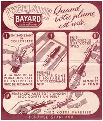 Scanning of a Bayard instruction sheet from '40s. For a Excelsior model. Back. On the other side of File:Bayard-Excelsior-Instro-Front.jpg. From an original package. Retouched by the author for a better sharpness.