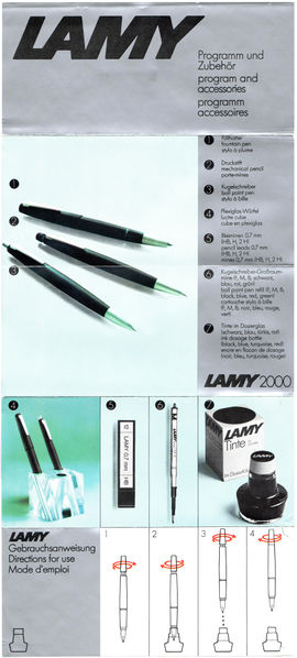 Scansione di un libretto di istruzioni Lamy degli anni '60. Relativo ad un modello Lamy 2000. Front. Sull'altro lato di File:Lamy-2000-Booklet-Rear.jpg. Da una confezione originale Ritoccata dall'autore per una migliore nitidezza.