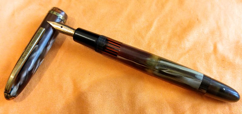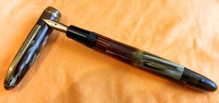 Photo of a pen produced by Alba. Filling system: piston filler. In striped gray celluloid. Ogival version with streamlined shape.
