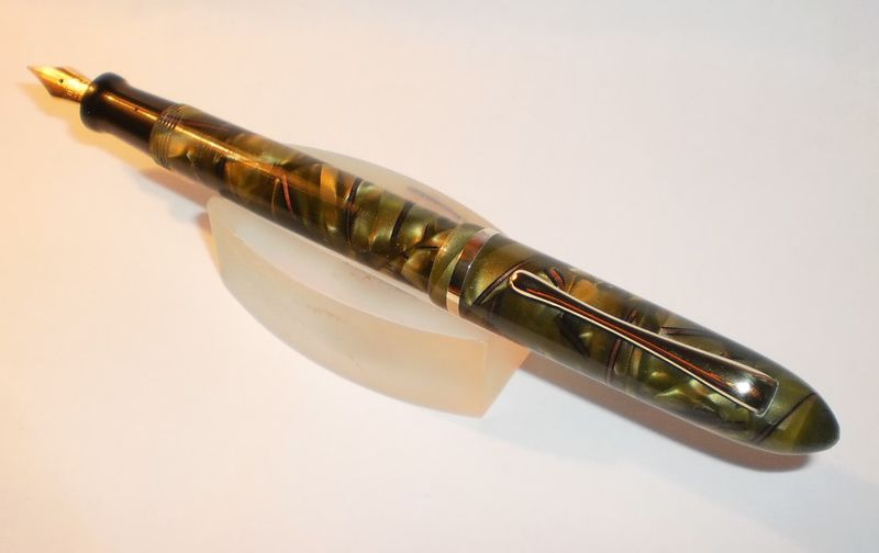 Photo of a pen produced by Alba. Filling system: button filler. In marbled green with silver string celluloid.