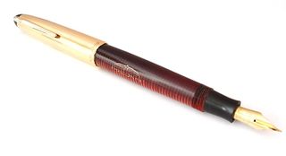 Photo of a pen produced by Ancora. Model: Ancora 97. Filling system: piston filler. In ringed red celluloid. Version of the Lusso model with celluloid barrel and rolled gold cap.