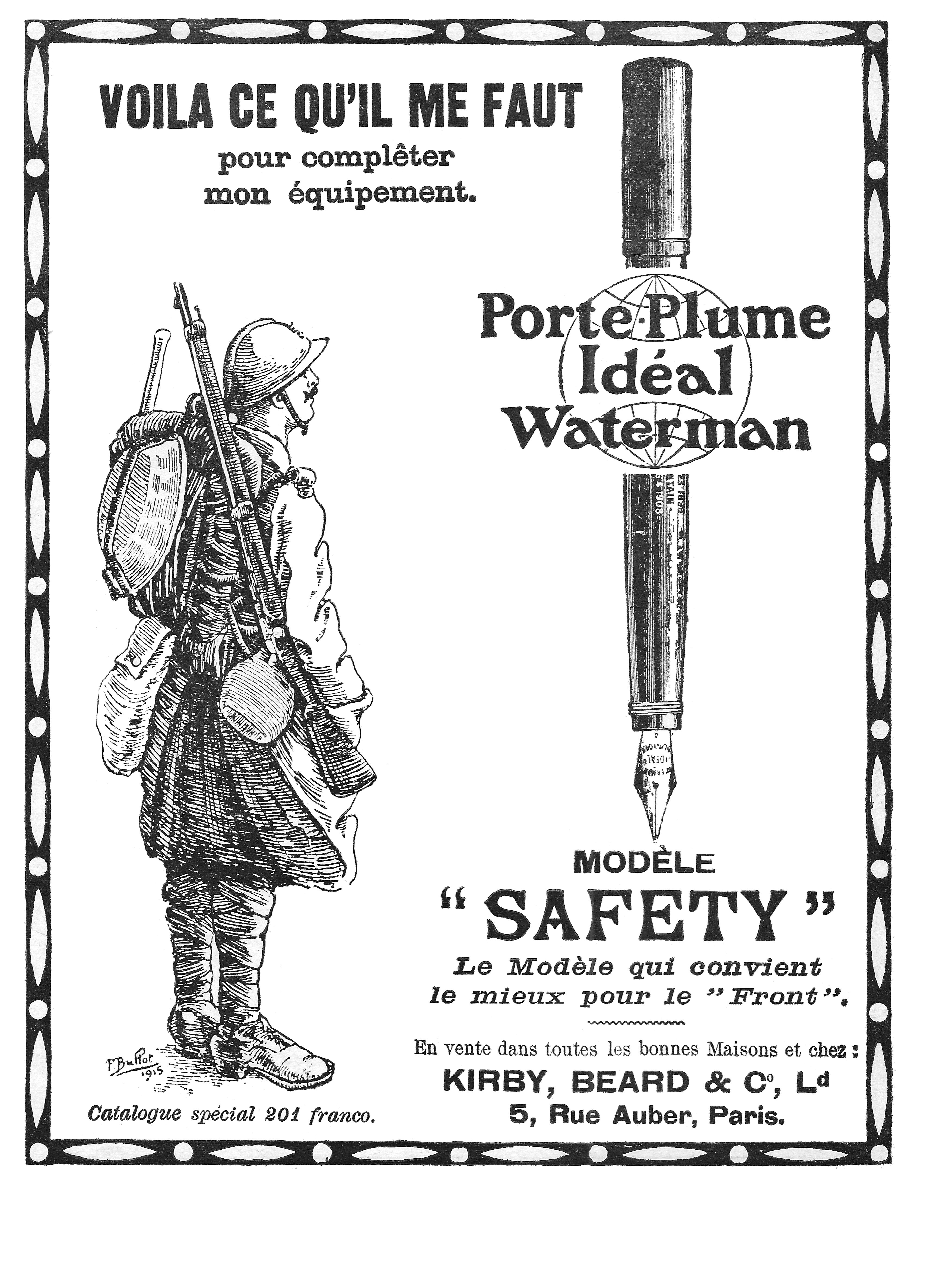 <multilang> @it|Scansione di una pubblicità Waterman del 1915 per un modello con safety|caricamento di sicurezza]]. Pubblicata probabilmente su L'Illustration. Ritoccata dall'autore per una maggiore nitidezza. @en|Scanning of a 1915 Waterman advertising for a safety filler model. Published probably on L'Illustration. Retouched by the author for a better sharpness. </multilang>