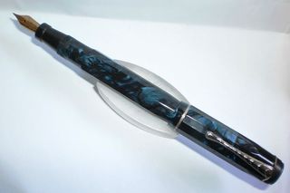 Foto di una Astura (produzione SAFIS) in celluloide blu con caricamento a pulsante. Contributo di Fabrizio Falchi, (utente forum fountainpen.it fab66).Gentilmente pubblicata e fornita dall'autore stesso.