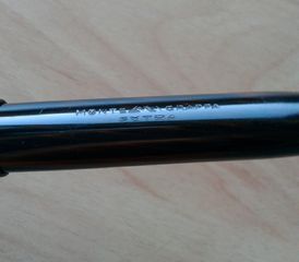 Foto di una Montegrappa, una Extra 206 in celluloide a arco marrone con caricamento a pulsante di fondo. Dettaglio della stampigliatura. Contributo di Giorgio (utente forum Musicus).