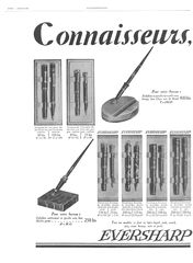 Scansione di una pubblicità Eversharp datata 1929-12-21. Pubblicazione su: L'Illustration. Ritoccata dall'autore per una migliore nitidezza. Data riportata sul retro del foglio. Pagina sinistra. Pubblicizza i modelli Personal Point, Deco Band, Wahl Engine Turned (lavorazioni Check e Grecian Border) e Tulip Clip ed alcune matite meccaniche.