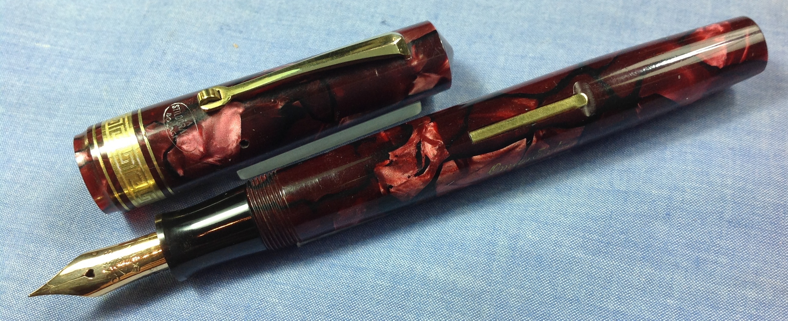 Foto di una stilografica Omas Extra in celluloide marmorizzata rossa, versione toda con vera recata e finiture dorate. Contributo di Massimo, utente forum Maxpen2012.