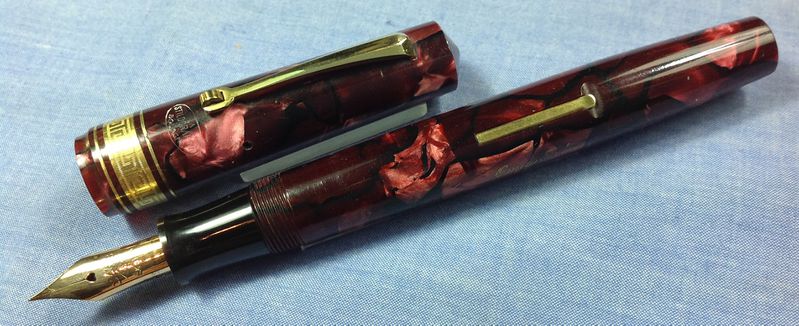 Photo of an Omas Extra in marbled red celluloid, round version with greek band and gold rolled finish.