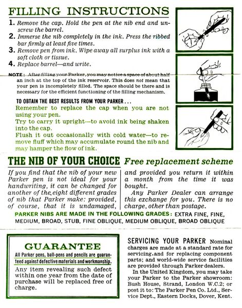Scansione di un foglietto di istruzioni Parker degli anni '60. Relativo ad un modello Parker Slimfold. Da una confezione originale Fronte. Sull'altro lato di File:Parker-Slimfold-Istro-Back.jpg. Contributo di Walter (utente forum fountainpen.it wallygator). Ritoccata dall'autore per una migliore nitidezza.