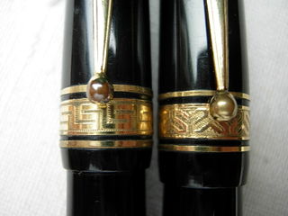 Photo of a pair of pens produced by Aurora. Model: Internazionale. Filling system: back lever. In celluloid. Showing the two kind of bands.