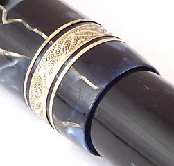 Photo of a pen produced by Aurora. Model: Superna. Filling system: back lever. In blue striated celluloid. Detail of band.