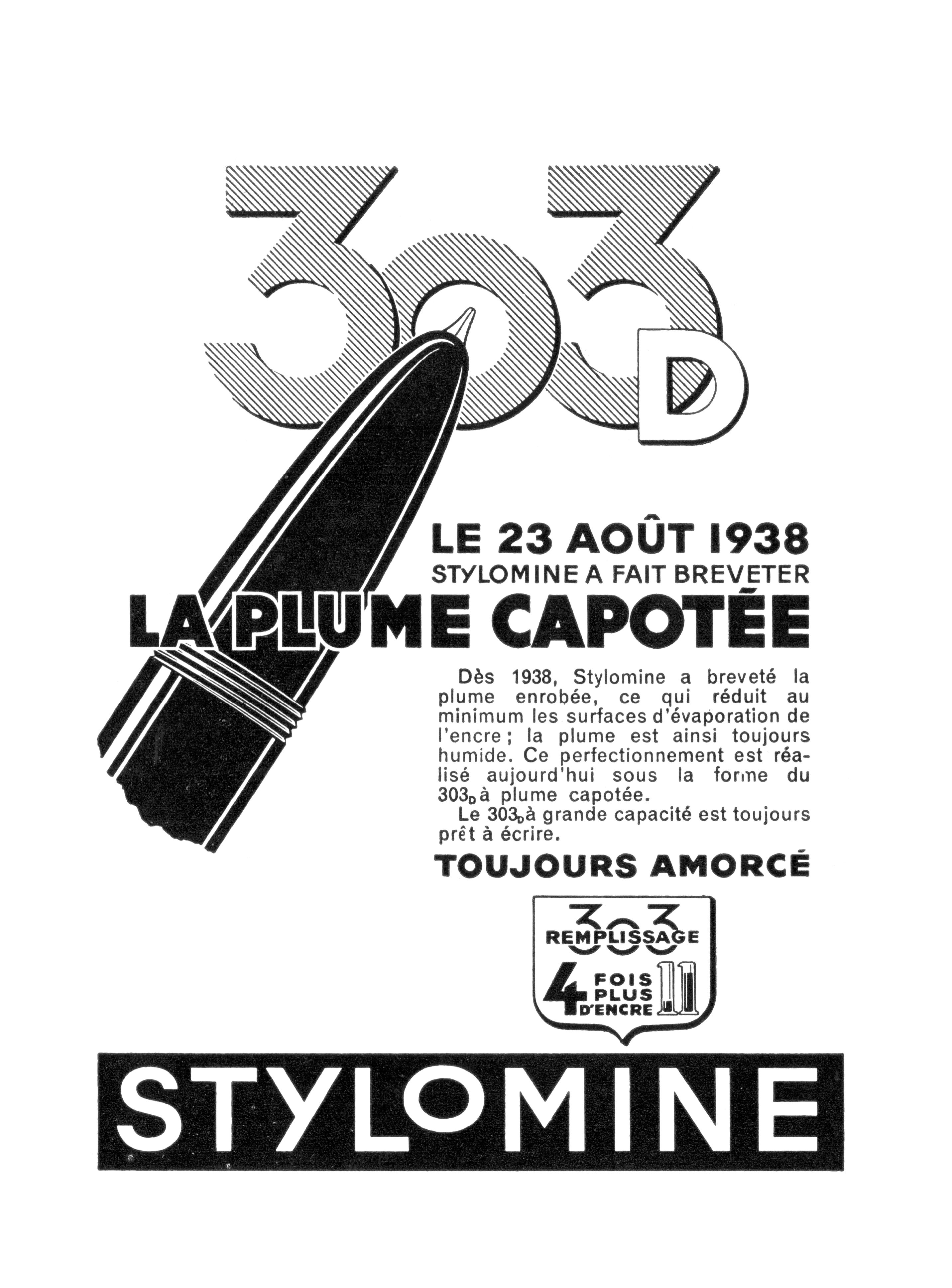 Scansione di una pubblicità Stylomine datata 1948-03. Pubblicazione su: Plaisir de France. Ritoccata dall'autore per una migliore nitidezza. Data indicata dal fornitore, affidabile. Pubblicizza il modello 303D a pennino coperto di cui proclama l'invenzione a partire dal 1938 (vedi brevetto nº FR-850525).