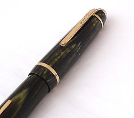 Photo of a pen produced by Columbus. Model: Columbus 132. Filling system: lever filler. In striated green celluloid.