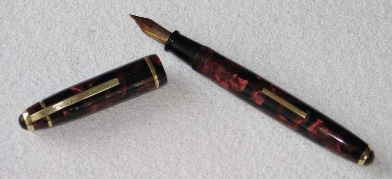 Foto di una penna Columbus. Modello: Columbus 134. Caricamento a levetta. Realizzazione in celluloide marmorizzata rossa. Contributo di Roberto Vetrugno (utente forum.fountainpen.it roberto v).
