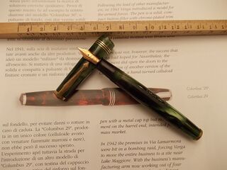 Foto di una penna Columbus. Modello: Columbus 29. Caricamento a pulsante di fondo. Realizzazione in celluloide marmorizzata verde. Versione inconsueta con finiture dorate e pennino in oro. Contributo di Stefano Marinucci.