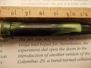 Photo of a pen produced by Columbus. Model: Columbus 29. Filling system: button filler. In marbled brown celluloid. Detail of inscription.