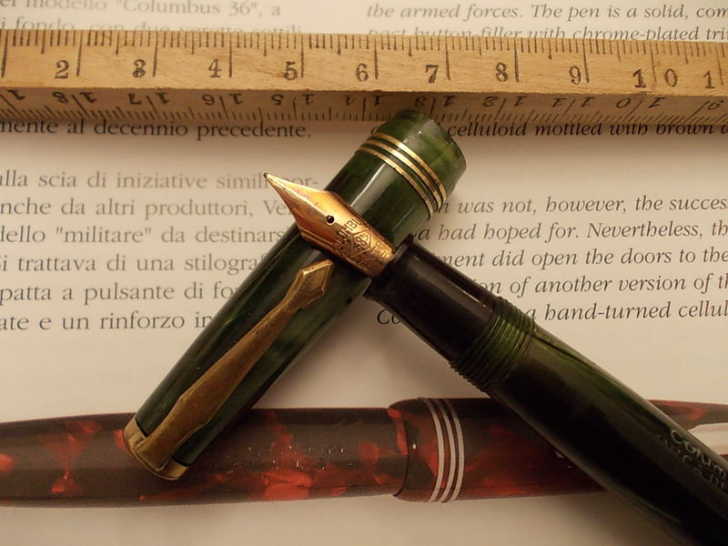 Foto di una penna Columbus. Modello: Columbus 29. Caricamento a pulsante di fondo. Realizzazione in celluloide marmorizzata verde. Versione inconsueta con finiture dorate e pennino in oro. Contributo di Stefano Marinucci.